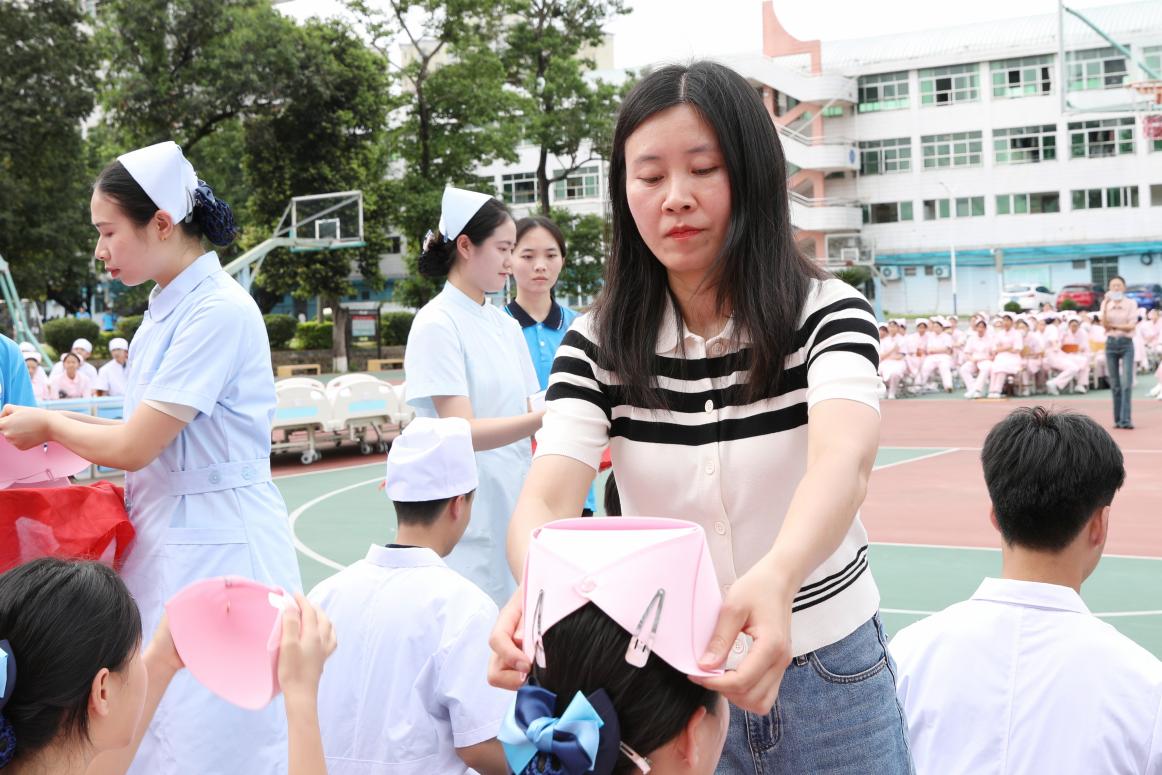 隨后,活動(dòng)進(jìn)行了新護(hù)生授帽、宣誓儀式。護(hù)理及智慧健康養(yǎng)老專業(yè)學(xué)生代表身著護(hù)士服,接受教師為她們戴上象征責(zé)任與奉獻(xiàn)的燕尾帽。錚錚誓言響徹會(huì)場(chǎng),“勿為有損之事,勿取服或故用有害之藥。盡力提高護(hù)理之標(biāo)準(zhǔn),慎守病人家務(wù)及秘密?!?/span>這是護(hù)理人傳承精神、接續(xù)使命的重要時(shí)刻,激勵(lì)著學(xué)校全體師生傳承光榮傳統(tǒng)、勇?lián)】凳姑?/span>