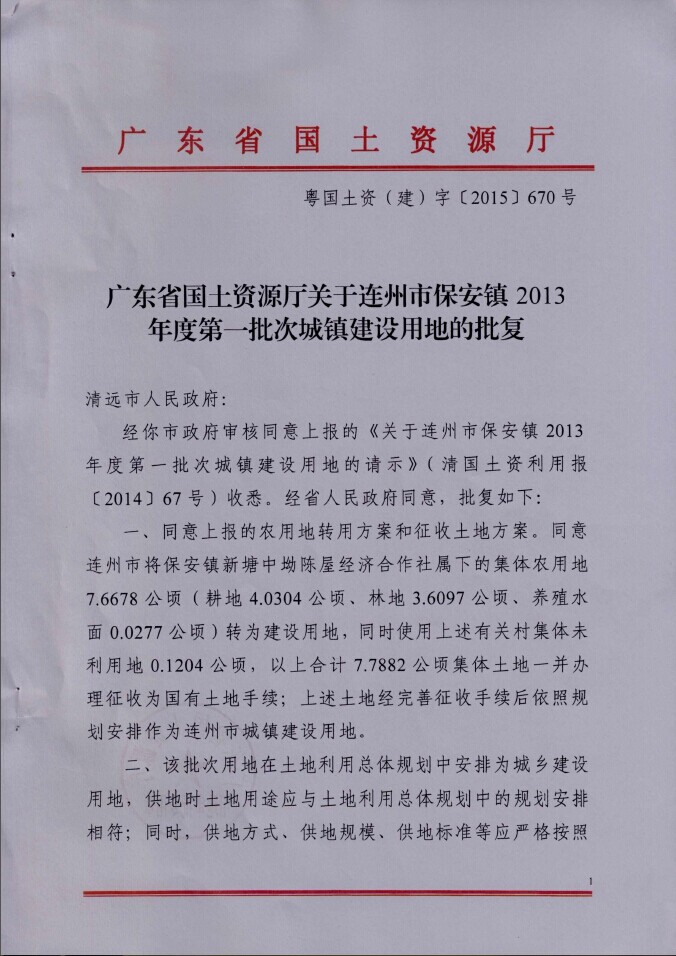 連州市保安鎮(zhèn)2013年度第一批次城鎮(zhèn)建設用地征地批準信息