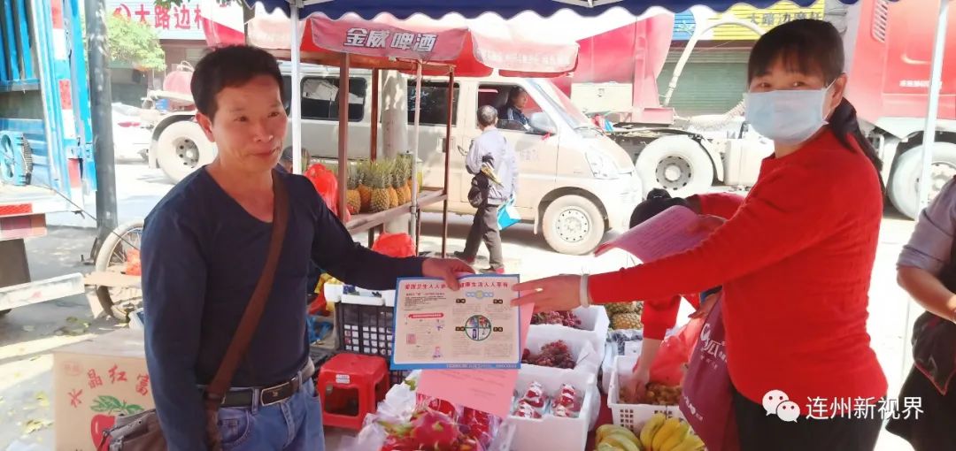 ▲工作人員向路邊的攤販發(fā)放宣傳資料